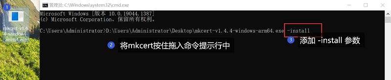 键盘按Win键+R键,输入cmd 回车,找到下载的mkcert,将mkcert的文件拖入命令提示符的窗口中,并添加上 -install 参数,回车。