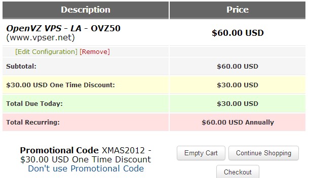 优惠码:XMAS2012 - OpenVZ方案512MB内存、50GB硬盘、1TB流量原价60美元优惠后30美元首年,点击购买。