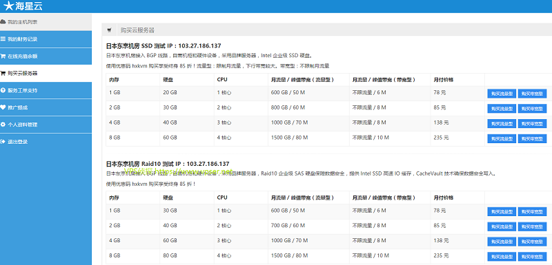 海星云是2016年成立的VPS服务商,从财务系统到VPS管理都是自主开发,采用KVM虚拟化,Windows、Linux都可以安装,目前只有日本东京机房,线路走的IJJ又转到pnap。目前分为流量型和带宽型两种流量计算方式,有SSD硬盘和普通硬盘两种存储方式。有点小遗憾是不允许V*N、S*S等相关服务。另外提醒用户买之前先看一下服务商的服务条款(TOS)确定服务商是否允许你所要运行的服务。