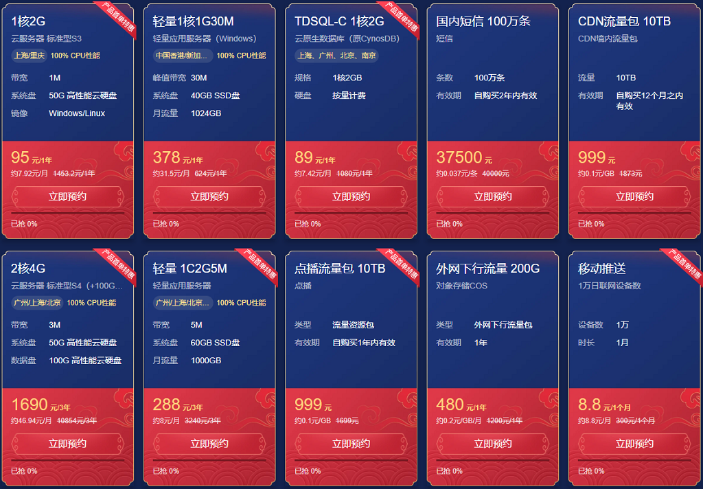 腾讯云新春采购季新用户购买入门级国内云服务器1核2G1兆 95元1年 288元3年(建议直接3年,买1年的续费要贵不少),对内存带宽要求高些的话可以考虑:2核4GB内存3Mbps带宽568元1年,1690元3年;轻量应用服务器1核2G5兆 288元3年性价比很高但是限制1000GB,一般用户来说是足够用了的。香港免备案方案1核1G30兆278元1年新老用户均可购买。老用户新购活动比较少轻量云2核4G5兆288元1年,续费3折起。另外老轻量云用户有免费升级活动。如果还是学生9元/月的学生云服务器不可错过。活动场次不同产品也不同。