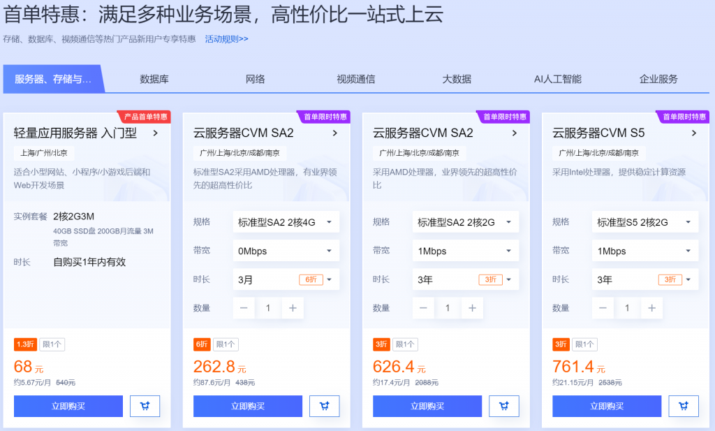 新用户新购最低68元起。点击访问腾讯云老用户续费活动页面